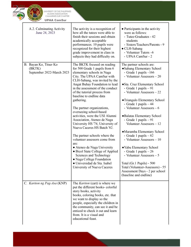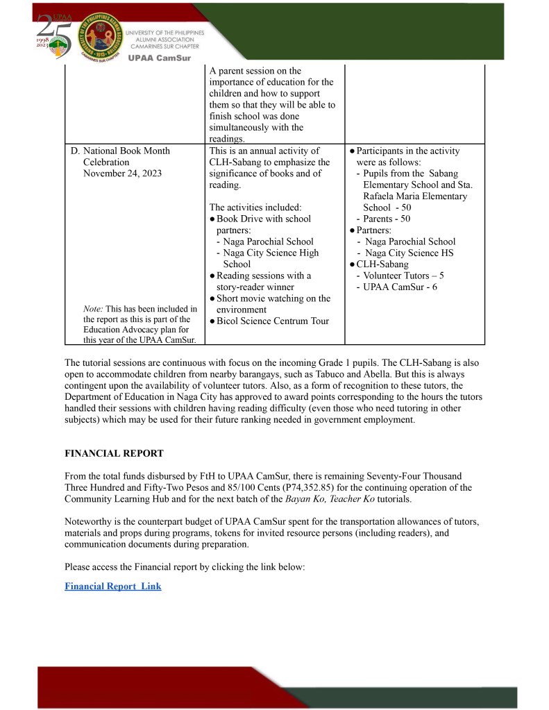 Received finally from the FtH last May 5, 2023 was the amount of One Hundred Nine Thousand Two Hundred Nineteen Pesos and 60/100 Centavos (P109,219.60) grant funds deposited into the BDO account of the University of the Philippines Alumni Association-Camarines Sur Chapter (UPAA CamSur). According to the BDO employee who contacted us, the amount floated for a while since the account name on the transaction document was not spelled out. Word of its approval though came to us as early as March from the Feeding and Nutrition Program Director, Bettina B. Obias. Thus, the UPAA CamSur Board decided to advance the money for the ongoing feeding activities and just make a reimbursement from the FtH funds when these arrive.